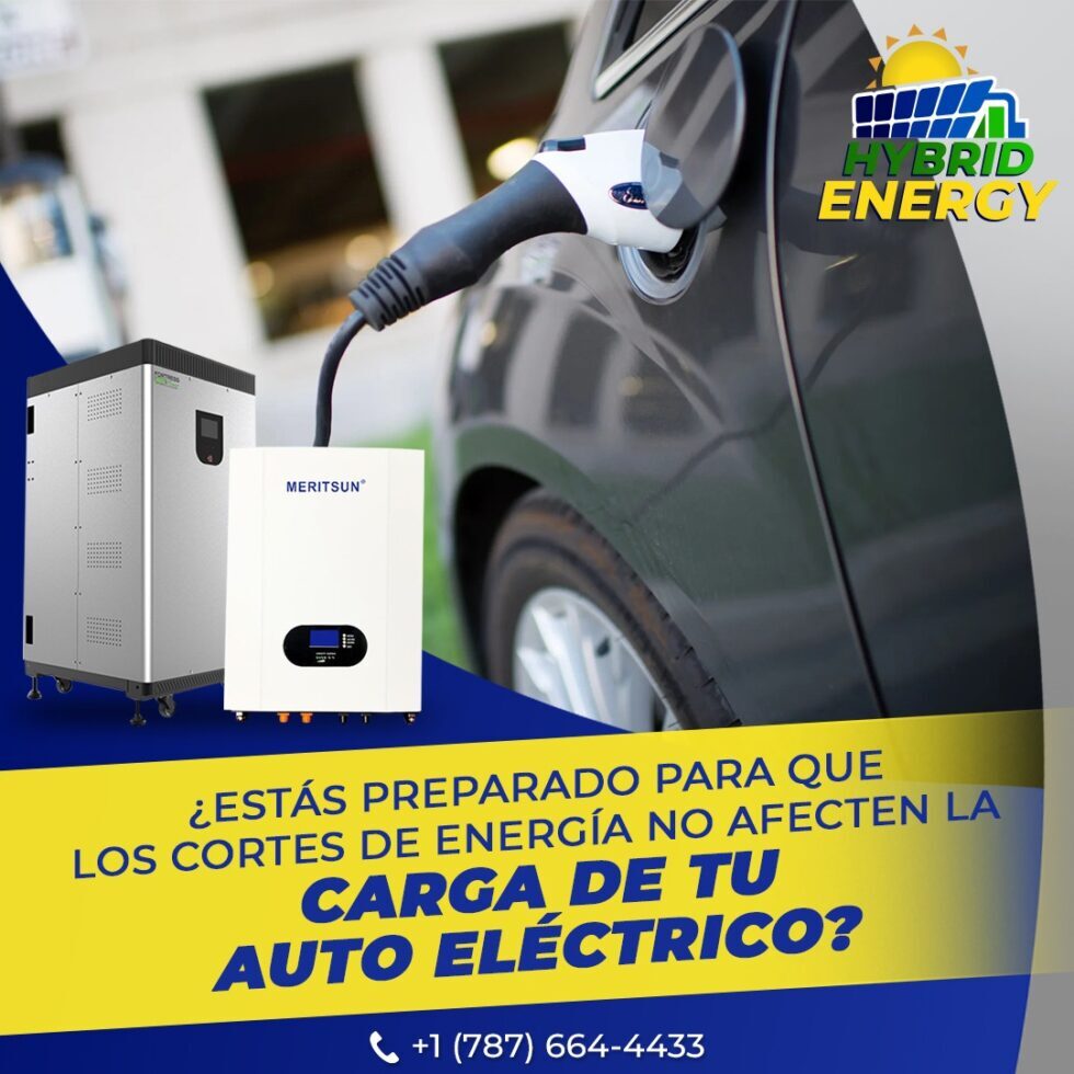 Para que los prolongados cortes de energía no afecten su movilidad eléctrica, Hybrid Energy PR le instala su sistema de almacenamiento de batería solar para que pueda producir su propia energía eléctrica y así garantizar la carga de su auto eléctrico.